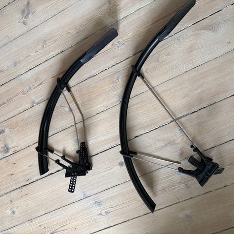 SKS Raceblade Pro XL skærmsæt til 28" hjul. Farve: sort. Skærmene er beregnet til racercykler og lignende cykler uden faste skærmbeslag. Monteres med justerbare beslag på for- og baggaffel. Velegnet til brug på cykler med smalle dæk, hvor der ønskes ekstra stænkbeskyttelse ved kørsel i vådt føre. Dækbredde 25-32mm. Nye i indpakning. Pris i butik 350,-