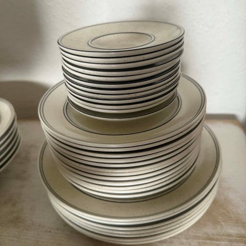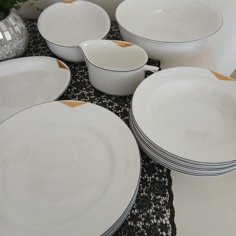 Gustafsberg stel i porcelæn bestående af tallerkener, skåle, kander og serveringsdele. Stellet er hvidt med enkel guldfarvet kantdekoration. Egnet som middagsstel, kaffestel og serveringsstel til borddækning i hjemmet. Velegnet til både daglig brug og mere formelle anledninger afhængigt af behov og sammensætning af delene i stellet.