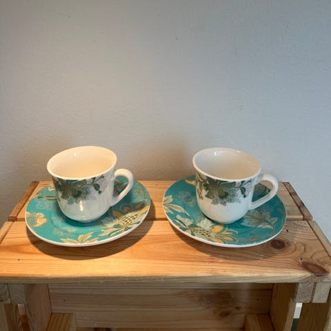 Jeg har brugt dem som krus uden underkopper. Den ene underkop er revnet og har et lille skår. Men kopperne er hele og fine og perfekte til kophylden.