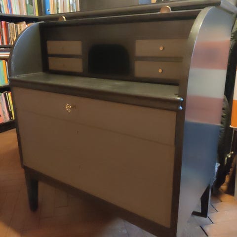 Sekretær skrivebord i træ med buet klap og overskab. Nederst tre store skuffer med greb i metal. Bag den buede klap er der skriveplade samt flere små skuffer og rum til opbevaring af papirer og kontorartikler. Overskabet har midterskab og sidefelter, som giver ekstra opbevaringsplads. Velegnet som opbevaringsmøbel i stue, kontor eller entré.