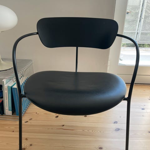 &Tradition loungestol designet af Anderssen & Voll. Stolen har sort sæde og ryg samt slanke metalben. Egnet som loungestol i stue, læsehjørne eller som ekstra siddeplads i hjemmet.