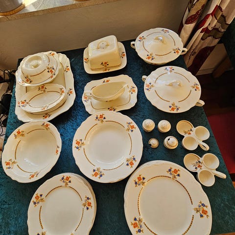 I tallerkensæt med blomsterdekoration 19 dele . Sættet består af tallerkener i hvidt porcelæn med bølget kant og blå kantlinje samt flerfarvet blomsterbort langs kanten. Velegnet som spisestel til hverdag og gæster. Sættet indeholder forskellige størrelser tallerkener, som kan bruges til hovedret, forret/dessert og eventuelt dybe tallerkener til suppe eller pasta.