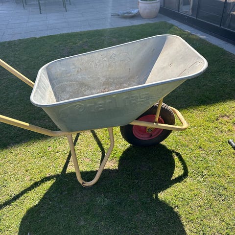 Trillebør i metal med punkterfri dæk. Kassen er i galvaniseret metal.