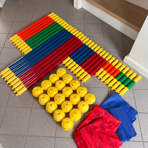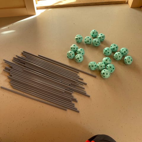 Kugler og stænger til at bygge huler. Der er uendelig mange timers leg i det, og så kan det opbevares på lidt plads.