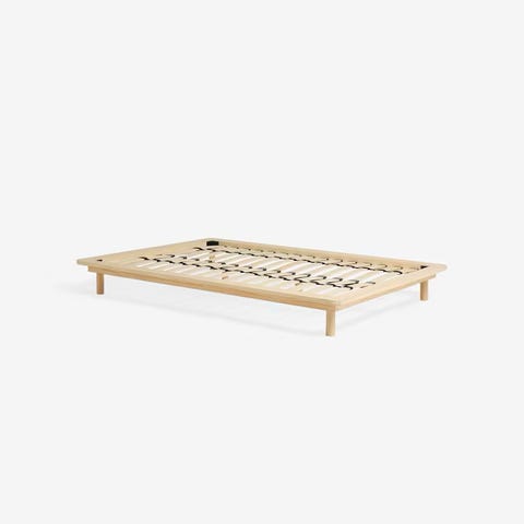 Beautiful solid wood frame with a clean Scandinavian design. The integrated shelves in the headboard are both practical and a nice design feature.