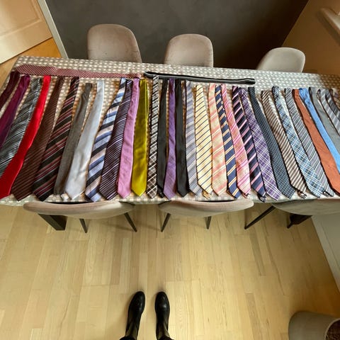 Parti herre slips i forskellige farver og mønstre. Flere klassiske og mønstrede designs, både lyse og mørke nuancer. Velegnet til brug med skjorte og jakkesæt eller andre formelle og semi-formelle outfits. Materiale og mærker varierer mellem de enkelte slips. Sælges samlet som parti til mand.