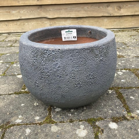 Flot rund havekrukke i terrazzo/betonlook – moderne og dekorativ