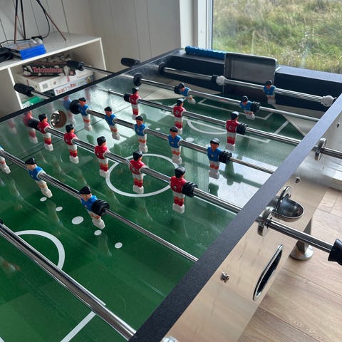 Bordfodboldbord med grøn bane og røde/blå spillere