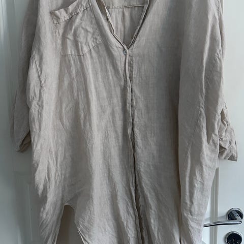 JDY bluse fremstillet i hør og viskose, størrelse 3XL til kvinder. Blusen er beige og har løs pasform med V-udskæring. Ærmerne er trekvartlange med mulighed for opsmøg og knaplukning. Velegnet som hverdagsbluse eller til afslappet brug. Fra ikke-ryger hjem. Muligt at få tilsendt pakken med GLS, hvis køber betaler fragten.