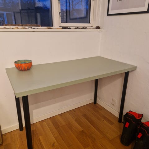 Lille skrivebord med skuffe med hul til ledningsudtag. Brugsspor på bordpladen.
