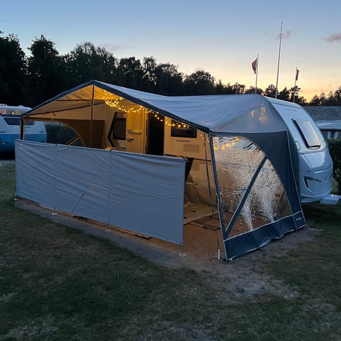 Egnet som ekstra overdækning eller læ foran campingvognen. Mål for solsejl: 3 m i længden (langs campingvognen) og dybde 2 meter.