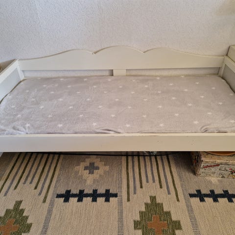 Hvid børneseng i ok stand sælges. Sengen er 2m lang og 80 cm, og der følger springmadras med. Der er desuden en god skuffe under sengen, der løber i sengens bredde. Sengen er brugt og har lidt løst baggærde - derfor den lave pris.