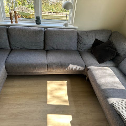 Har lidt pletter, men ikke forsygt fjernet. Man sidder meget godt i den, men den er for stor til vores hus da vi lige er flyttet ind og stuene ikke er så stor, kommer fra hus med hun men uden rygning, hunden har dog ikke fået lov til at ligge i møblet😁