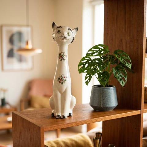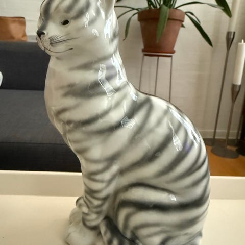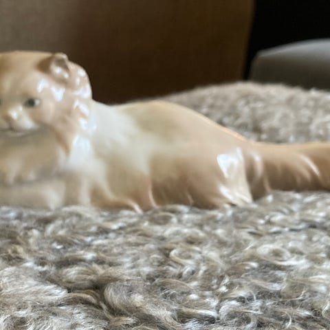 Porcelænsfigur fra spanske Lladro, formet som en liggende kat i beige og hvid glasur. Figuren er detaljeret modelleret med markerede ører, poter og Velegnet som dekorationsfigur i fx reol, vindueskarm eller vitrineskab.