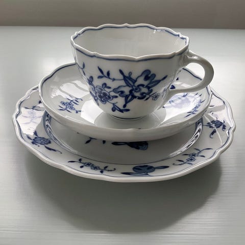Kop og underkop i porcelæn i hvid med blå blomstermønster. Sættet består af en kop med hank og tilhørende underkop. Dekorationen er et blåt blomstermotiv langs kanterne på både kop og underkop. Egnet til servering af varme drikke som kaffe eller te. I alt 4 stk og har 3 kagetallerkener sælges for kop og underkop 15 kr og dessert tallerken 10 kr stk