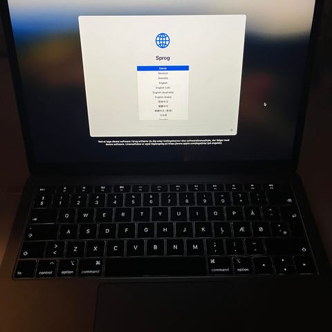 Apple MacBook i sølvfarvet aluminiumskabinet. Enheden har skærm med synlige skader og fejlvisning, som fremgår af billederne men fungerer ellers. Velegnet som reservedele eller til reparation.