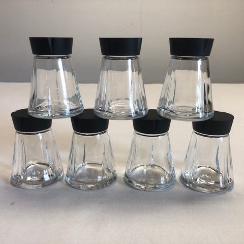 Rosendahl krydderiglas i klart glas med sort plastlåg. til opbevaring af forskellige krydderier som salt, peber eller tørrede urter.
