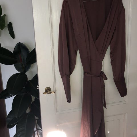 En meget smuk blomstret kjole med flæse halskant og i taljen . Lange ærmer med flæsekant. Nederdelen er med blåt foer som kjolen