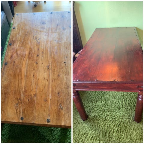 Sæbehandlede sildebensbord i massive egetræsparketter. Købt hos snedkere med følgende mål: H75, B90, L160.
