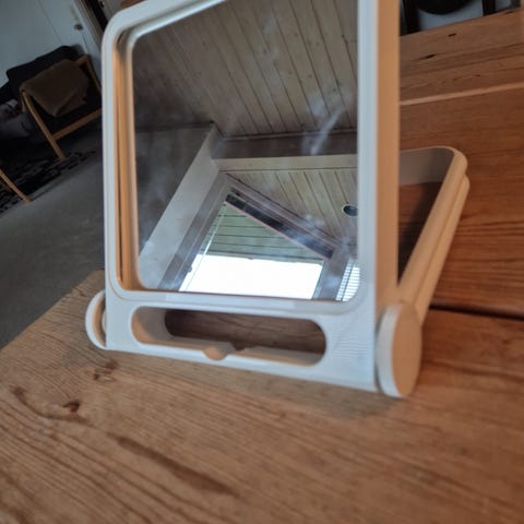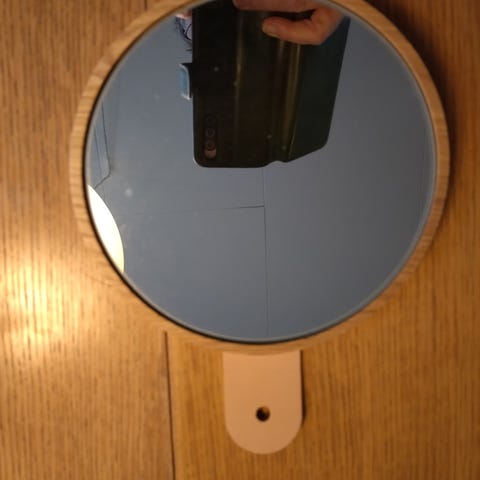 Bordspejl med rund spejlflade og base i hvidt træ. Spejlet er monteret i en træramme med lyse træben. I basen er der en udtræksskuffe med sommerfugleformet greb på fronten. Egnet som spejl til bord eller kommode, fx til opbevaring af småting som smykker eller hårtilbehør til piger