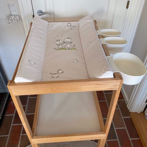 Stokke puslebord i træ med flere hylder til opbevaring. Inklusiv hvide plastkurve i siderne. Meget stabil konstruktion og står på hjul, så det er let at flytte rundt. Egnet til pusleplads på børneværelse eller badeværelse.
