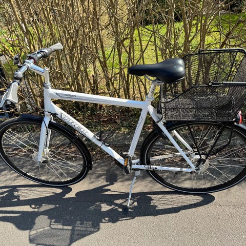 Scott racercykel i størrelse M med 28"/700c hjul til mænd. Cyklen har let ramme med lige styr og smalle dæk egnet til kørsel på vej og cykelsti. Farven er hvid med matchende sadel og styrgreb. Udstyret med fælgbremser for og bag samt gearsystem velegnet til pendling og træning på landevej.