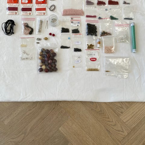 Blandtede smykkedele bestående af flere pakker perler og mellemstykker til smykkefremstilling. Sættet omfatter blandt andet ferskvandsperler, sorte agater, metalperler og forskellige mellemstykker i hovedsageligt guld- og sølvfarver samt enkelte poser med perler i andre farver. Delene er velegnede til fremstilling eller reparation af armbånd, halskæder og andre smykker. Leveres som et samlet parti, hovedsageligt i original emballage.