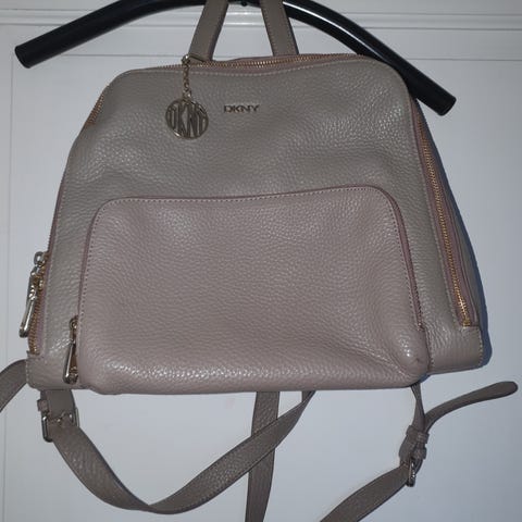 Super flot DKNY rygsæk i ægte okseskind, som det fremgår af mærket indvendigt. En tidløs og klassisk model med snorelukning og overklap med magnetlås, der giver et afslappet, men eksklusivt udtryk.