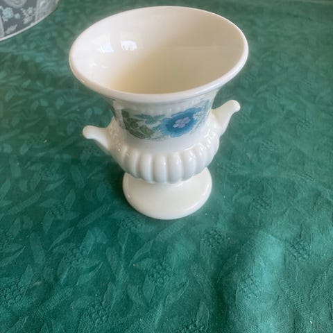 Porcelæn æggebæger i hvid med grøn dekoration på siden og to grønne striber. Klassisk form med fod, velegnet til servering af blødkogte eller hårdkogte æg. Neutral farve og enkelt mønster, der passer ind i de fleste stel og borddækninger.