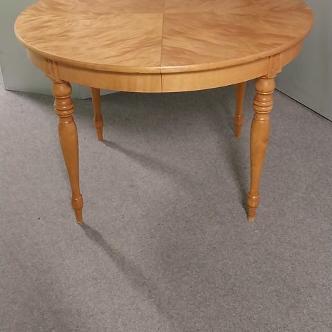 Klassisk rundt spisebord i træ med udtræk sælges inkl. 4 matchende stole. Bordet er solidt, funktionelt og kan nemt udvides med de medfølgende tillægsplader.
