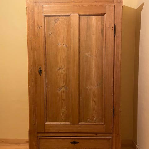 Blåt karlekammerskab til istandsættelse. Træet fejler intet, malingen har set bedre dage.