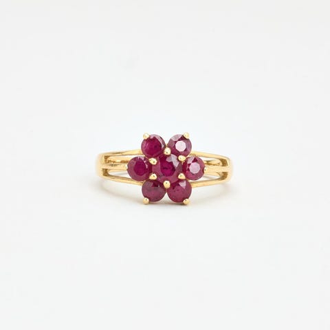 Rosetring i 14K guld med en rød og flere hvide sten, Str.
