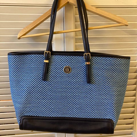 Tommy Hilfiger stof taske til kvinde. Tasken er fremstillet i blåt stof med lyst kontrastmønster og lyse remme og kanter. Den har to skulderremme og åbnes med magnetlukning. Indvendigt er der mørkt foer samt lynlåslomme og åbne lommer til mindre genstande. Velegnet som hverdagstaske eller shopper med god plads til personlige ejendele.