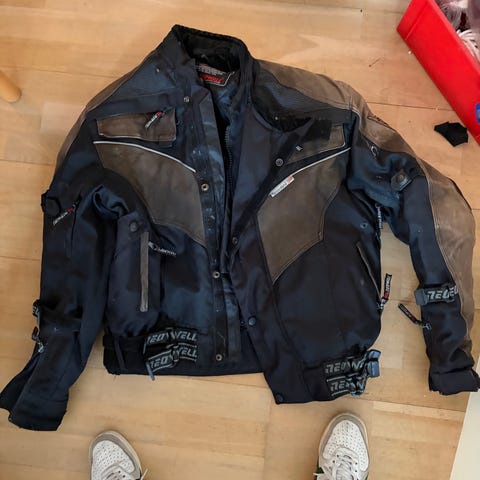 Lookwell motorcykeljakke i størrelse M. Jakken er sort med røde detaljer og har aftageligt, quiltet inderfor. Den er udstyret med lynlås- og trykknaplukning foran samt justerbare stropper i taljen. Egnet som beskyttende overtøj til motorcykelkørsel.