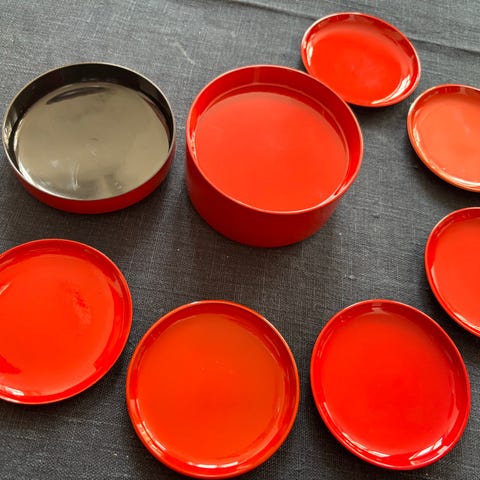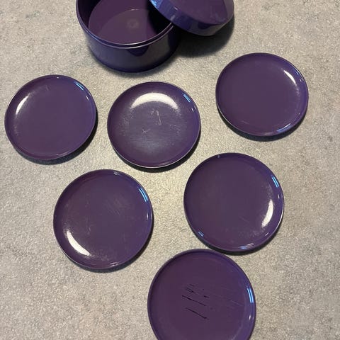 En rund, rød container med låg, der indeholder 6 matchende coasters / glasbrikker.
