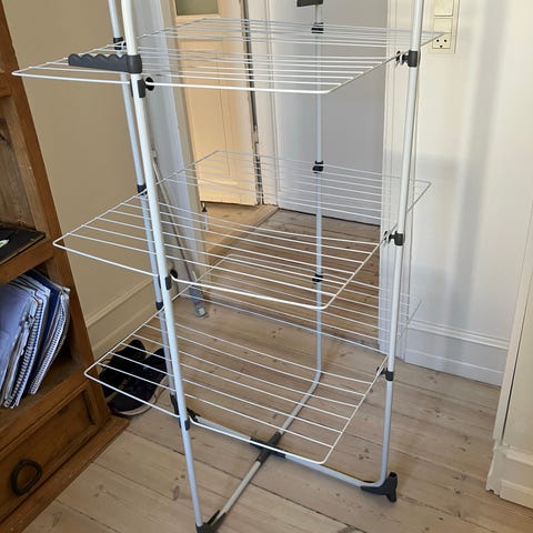 Sammenklappeligt tørrestativ i hvidt metal. B1 100kr, b2 55 Til begge 120kr