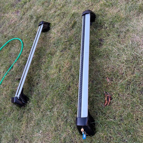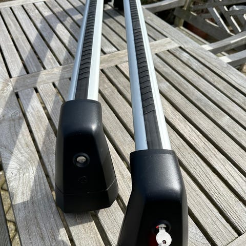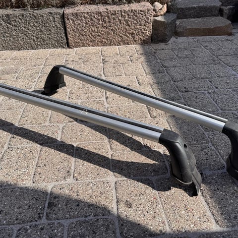 Mercedes-Benz A212 890 04 93 tagbøjler i aluminium med plastfødder og integrerede låse. Originale tagbøjler egnet til montering på bilens tagrails. Velegnet som base til montering af tagboks, cykelholder eller andet tagudstyr, afhængigt af bilmodel og kompatibilitet med den angivne reservedelsnummerkode.