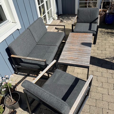 Trænger til at blive vasket, også falder den ene pind under den ene stol af nogen gange. Men er lige til at sætte fast igen. Kan evt limes fast.