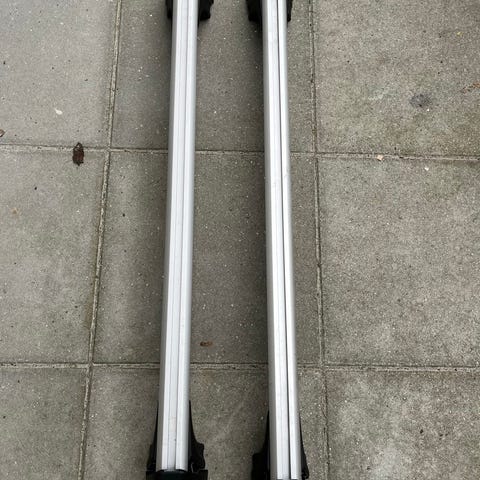 Skoda Octavia II Combi tagbøjler i aluminium i sølvfarve. Tagbøjlerne er beregnet til montering på Skoda Octavia II Combi (modelår omkring 2004 ifølge mærkat) og har en maksimal belastning på 75 kg. Udstyret med plastfødder til fastgørelse på bilens tag. Velegnet som basis for montering af fx tagboks, cykelholder eller andet tagbagageudstyr, inden for den angivne vægtgrænse.