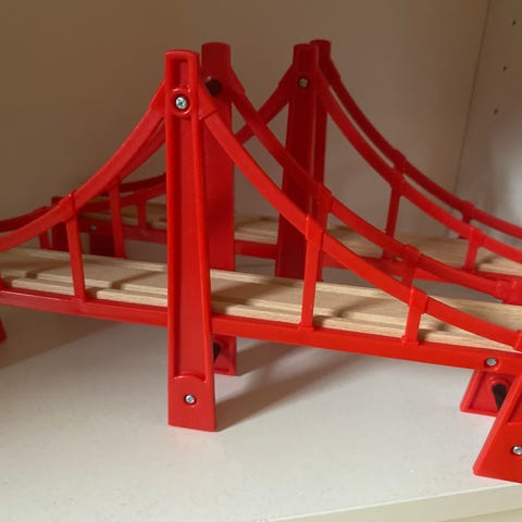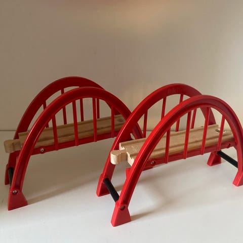 Sættet består af en base i træ med integrerede skinner, grøn bund og grå klippeformationer i plast. I midten er der en brun brodel, som kan hæves og sænkes, så tog kan køre under eller over. Passer til almindelige trætogsskinner med standard samlinger i hver ende. Egnet som tilbehør til børns trætogsbaner indendørs.
