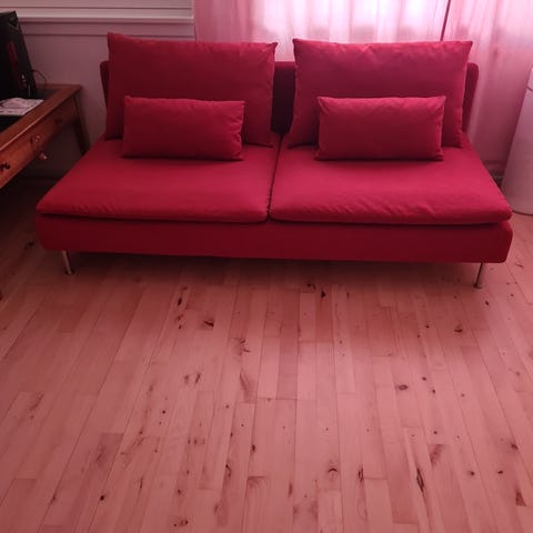 Bortgives gratis Söderhamn sofa mørkegrå. Ben skal tilkøbes for 100 kr for alle fire, søg på “landskrona” på Ikeas hjemmeside. Er brugt men ok pæn