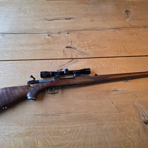 Pæn velholdt stand og med kikkert. Se mere info på billederne. Træning/ jagt patroner, skydestok, rem og rensesæt medfølger. Riffel udleveres ikke før våben tilladelse er søgt, betalt og udstedt. Tlf 20 68 52 94 for mere info.