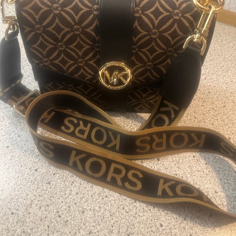 Skuldertaske i kunstlæder til kvinde. Tasken er i brun nuance med M-mønster og guldfarvet logo på fronten. Den har klaplukning og justerbar skulderrem. Indvendigt er der opdelt rum med lynlåslomme og åbne lommer til mindre genstande. Velegnet som hverdags- eller bytetaske med plads til mobil, pung og småting.