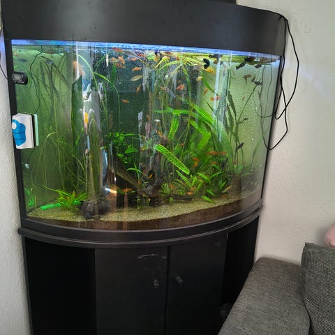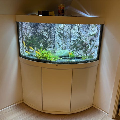 Akvarium i hjørnemodel med buet frontglas og tilhørende sort underskab. Akvariet er egnet til placering i et hjørne, som illustreret på tegningen med mål ca. 135 cm på fronten og 86 cm på siderne. Højden uden bord er angivet til ca. 61 cm og med bord ca. 130 cm. Velegnet til indretning som ferskvands- eller saltvandsakvarium afhængigt af udstyr og indretning. Skabet under akvariet giver plads til opbevaring af teknik og tilbehør.