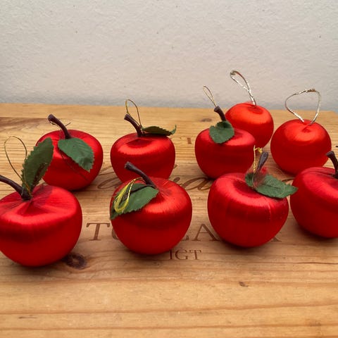 Ti smukke æbler, røde og nogle med blade. Julepynt af ældre dato fra 70’erne eller 80’erne ca 5 og 3 cm ø , æble jule æble hæng dem på juletræ eller grene enkelte skal lige have en tråd med mindre de skal ligge og pynte i en glaskål eller på et fad