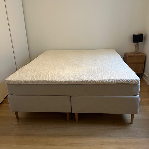 Vi tænker vi skal have en større seng og sælger derfor vores seng. Den er 2,5 år gammel. Hårdheden er fast. Topmadrassen har betræk som netop er vasket. Vi har været glade for den men tænker vi skal have en bredere efter vi er blevet 3 og forøger til 4 til sommer. Befinder sig på Islands brygge.