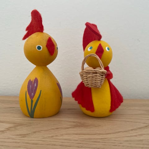 Sættet består af to små figuriner udformet som kyllinger, udført i glaseret porcelæn i lyse gule og grønne nuancer. Figurerne er velegnede som påskepynt og kan bruges som borddekoration eller som del af en samling