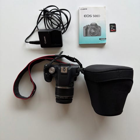 Sælger mit Canon EOS 500D kamera som et komplet sæt – perfekt til dig der vil i gang med rigtig fotografi uden at skulle købe noget ekstra.