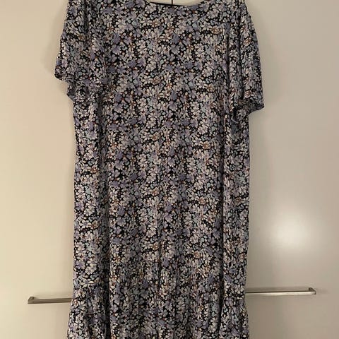 Sommerkjole, størrelse 42, den er 97% polyester og 3% elastine. Den er fra Pieces eller Only. Jeg kan godt sende til dig