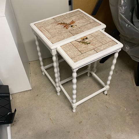 Det ene lille bord har mørk plamage. Ikke forsøgt slebet ela